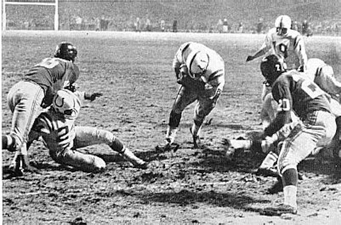 The muted colorization befits a cold, overcast Dec. 28th in a not-so-grand looking Yankee Stadium, where the grass was dead and much of the field was made up of infield dirt. There the two teams battled it out, kicking up dust and slipping on unsure footing in a game marked by both recurring fumbles and precision plays.